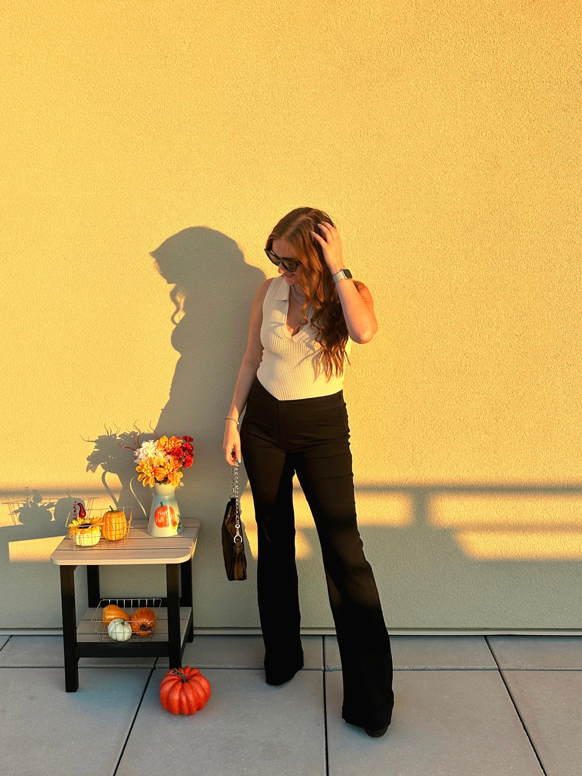 The it pants this fall! Features an overlapped waist band, flare hem, and pull on pants. Pair with our Ruby Cropped Turtleneck Sweater and booties for a trendy fall look.